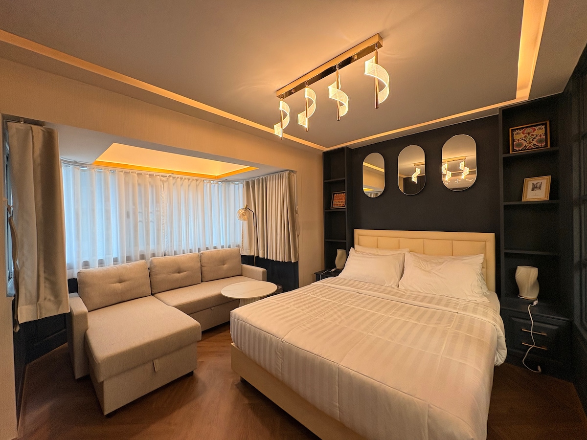 Disfruta del encanto moderno de esta habitación decorada con mucho gusto. ¡Totalmente amueblado con todos los electrodomésticos que mejoran la comodidad de tus estancias! Todo el alojamiento será tuyo [dormitorio, baño, cocina y sala de estar]. Colchón tamaño king suave y cómodo y juego de sábanas Muji. Wifi gratuito, SmartTV de 60 pulgadas con Netflix gratuito, purificador de aire, lavadora con función de secado, plancha, horno microondas, nevera, vitrocerámica eléctrica y utensilios de cocina. Baño con ducha de efecto lluvia y máquina de agua caliente.