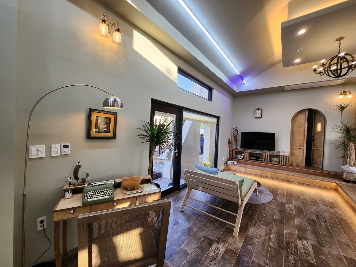 노을이 예쁜 '저지안트레' 는 제주 서쪽 올레길 14-1이 지나는 감귤농장 안에 있어요. 2층으로 구성된 안트레 밖거리 공간인 '건축가의 서재'는 귀농한 건축가의 시.공간에 묵으며 새로운 공간 경험할 수 있는 특별한 기회를 가져볼 수 있어요. 아침 일찍, 발코니에서 바로 보이는 저지오름의 촉촉한 나무향과 함께 정상에 올라 서쪽 바다까지의 제주를 한껏 느끼며 하루를 시작해 보세요. 자전거로 5분, 살짝 바람을 느낄 즘이면 저지예술인 마을에 도착해요. 현대 미술관, 김창열 미술관 그리고 아기자기한 갤러리가 있어 색다른 예술 체험 여행을 즐길 수 있어요. 또한 주변에 있는 작은 서점들을 둘러보며 개성있는 까페에서 잠시 쉬어가 보는것도 좋겠지요. 차로 2분 거리에 편의점과 세탁방, 그리고 작은 로컬 식당에서 아침도 추천드려요. 오설록, 신화월드, 도립 곶자왈, 금오름, 금릉, 협재 해변 등, 10분 정도면 많은 곳으로 편리하게 갈 수 있어요.