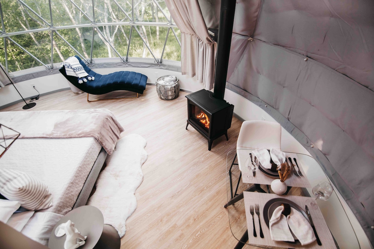 Ubicado junto al río, cada domo está totalmente equipado con su propio baño privado, cocina pequeña y bomba de calor para que puedas alojarte con comodidad. Las cúpulas están diseñadas de forma única utilizando muchos elementos ecológicos y los huéspedes disfrutarán de la belleza de la naturaleza por dentro y por fuera. Los huéspedes pueden disfrutar de un espacio exterior privado con su propia bañera de hidromasaje, barbacoa y chimenea de propano. Quédate en este alojamiento único y disfruta de los sonidos de la naturaleza.