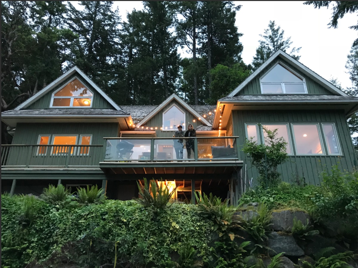Tranquila suite con jardín junto al mar con zona de patio cubierto, mesa de fuego y barbacoa. Camino empinado a una playa privada. Disfruta de vistas panorámicas al mar desde tu suite y observa cómo juegan las nutrias y cómo salen a la superficie las ballenas. Las águilas se elevan desde las copas de los árboles y los colibríes revolotean por el jardín. La suite recién reformada cuenta con una cocina totalmente equipada. Un baño para mimarte con bañera/ducha y suelos radiantes. Dormitorio king con chimenea eléctrica (sin ventana) y segundo dormitorio con litera (separado con cortinas de la sala de estar principal)