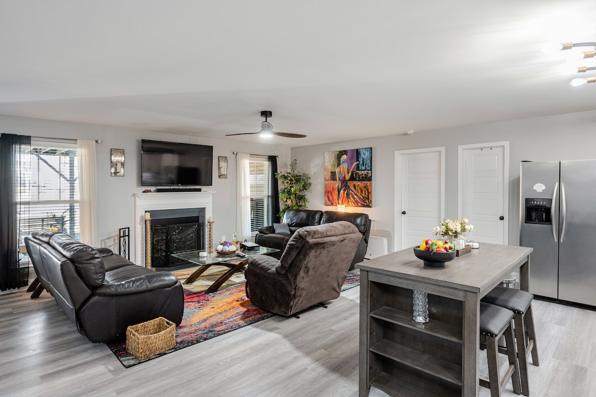 Te damos la bienvenida a At Ease Retreat, tu escapada en el área de Fort Bragg diseñada para viajeros militares, grupos de golf y aventureros al aire libre. Este alojamiento de 3 dormitorios y espacio flexible cuenta con cerradura inteligente, un baño principal estilo spa, un espacio de trabajo exclusivo y una barra de café para empezar el día. La habitación flexible es perfecta para hacer yoga o relajarse, y el patio completamente vallado ofrece tranquilidad para las mascotas. ¡Ubicado en una comunidad tranquila y amigable! Comodidad y conveniencia Tenga en cuenta que todos los dormitorios y baños completos están en el segundo piso