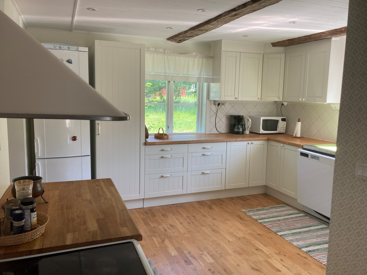 Relájate con la familia en este espacio tranquilo. Está cerca de la naturaleza, pero también en el centro de Söråker. Es una casa de campo de nueva construcción con un alto nivel. Un dormitorio con una cómoda cama doble de 180 cm y una habitación con una cómoda cama individual de 120 cm. Tenemos un bonito sofá cama de 140 cm de ancho donde también puedes dormir dos. Hay wifi disponible y un baño agradable con ducha y lavadora y secadora. Hay un terreno acogedor que tienen todo para ustedes. Con chimenea, muebles de exterior, hamaca y parrilla a carbón.