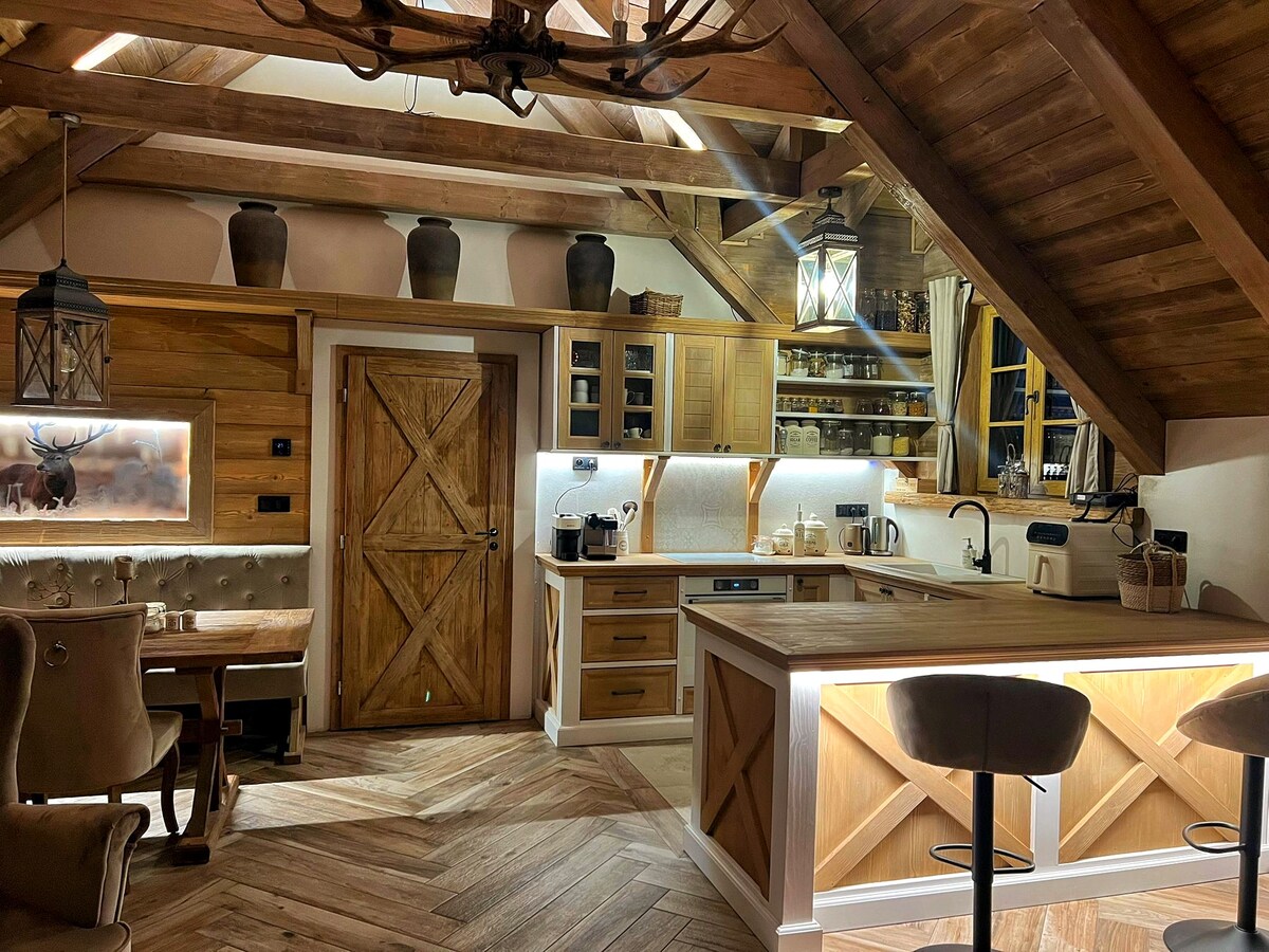 Nadstandardně vybavená chalupa pro všechny, kteří mají rádi panenskou přírodu a přesto si rádi dopřejí luxusní ubytování. K dispozici je prostorná zahrada, kde se nachází pergola s terasou. V případě nepříznivého počasí můžete posedět ve společenské místnosti s krbem. Zažijte relax v koupacím sudu s vířivkou s jedinečným výhledem (za příplatek). Koupací sud je umístěn venku a je v provozu od 1. března do 31. října (podle aktuálních teplot). Neumožňujeme ubytování s domácími mazlíčky.