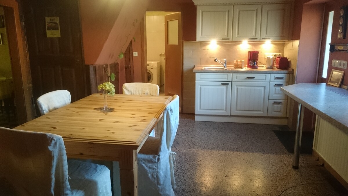 «Vivir entre muros antiguos como en los tiempos de la abuela»: apartamento de vacaciones en la casa protegida de doble sala con cocina, pequeño baño con inodoro y ducha, una habitación con dos camas individuales, una habitación de paso con cama doble y otra pequeña habitación con cama doble y cuna. Disfrute del ambiente de nuestro patio delantero y de la extensa zona ajardinada de 6000 m² con estanque, huerta, escalera de los sentidos, animales y mucho más.
