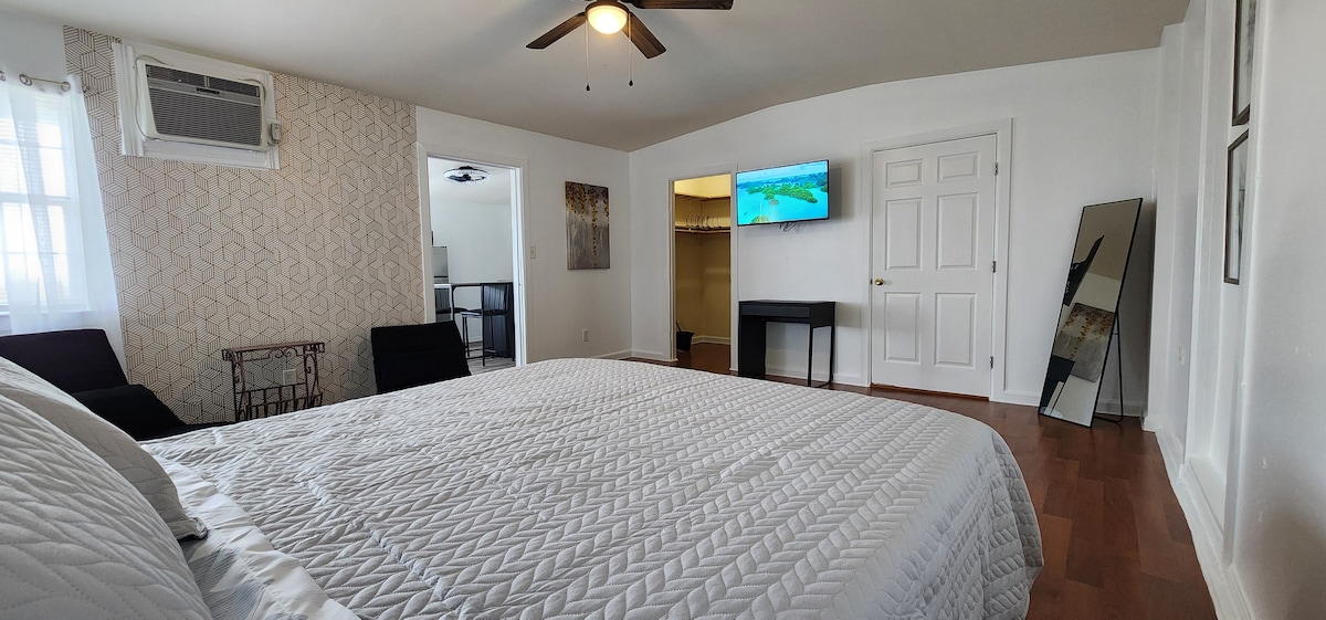 Perfecto refugio en el sur de Austin a pocos minutos del vibrante South Congress, el moderno South Lamar, el icónico Barton Springs, el pintoresco lago Lady Bird y el corazón del centro de la ciudad, junto con aparcamiento gratuito. En el interior encontrarás un amplio dormitorio con una lujosa cama tamaño king californiana y un amplio armario. Grandes ventanales para la luz natural (las cortinas están en todas las ventanas para mayor privacidad). Para espacio adicional para dormir, la acogedora sala de estar incluye una cómoda cama tamaño queen extraíble del cómodo sofá.