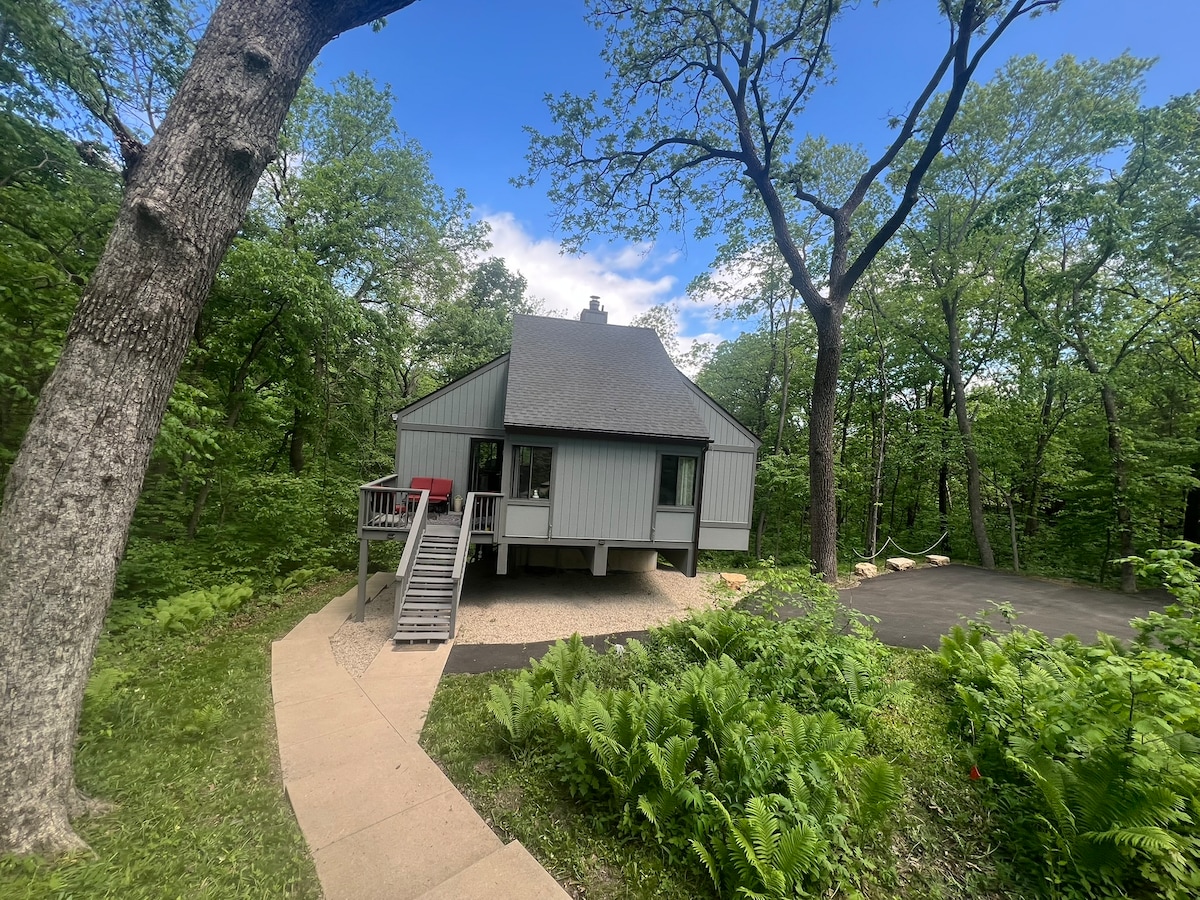 Unique "tree house" - an octagon tiny house, surrounded by the woods! 2 bedroom, 2 bathroom home you can enjoy the views of nature all around, with floor to ceiling windows. One king bed, one queen bed. Modern comforts with fun flash blacks. Private hot tub and firepit look into serene woods! Sit by the indoor gas fireplace and enjoy our record collection. Soak in a Japanese soaking tub. Enjoy fall colors or watch snow fall! Community indoor poor, seasonal outdoor pool, gym access