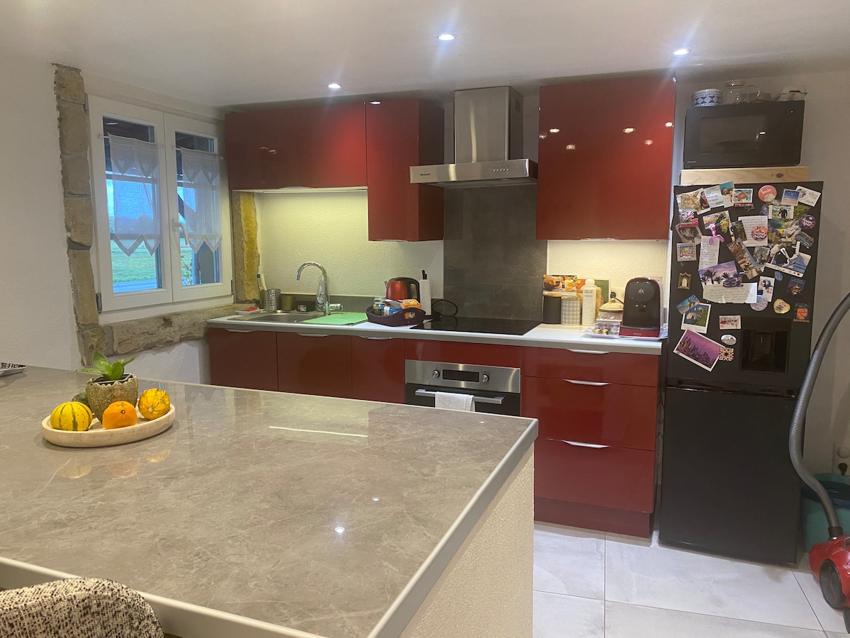 Bienvenue à la tanière du loup, logement 1 Appartement de 50 m2 rénové en 2020, meublé et équipé avec tout le nécessaire pour que votre séjour se passe comme à la maison. Située dans un endroit calme et reposant. L'accès est indépendant avec une terrasse et parking privé (le parking à une vidéo surveillance) Cuisine tout équipée Salon : canapé convertible 140/200, TV orange et Netflix inclus Chambre 1 double lit 180/190 Salle de bain équipée: sèche cheveux, serviettes, ect..
