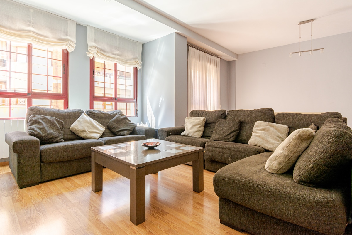 El piso está ubicado en la planta 1, en pleno centro de la ciudad, a 1 minuto andando de la Gran Vía, el alojamiento no dispone de aparcamiento propio pero es fácil aparcar por la zona, enfrente hay un supermercado y hay varias cafeterías y restaurantes en la zona.