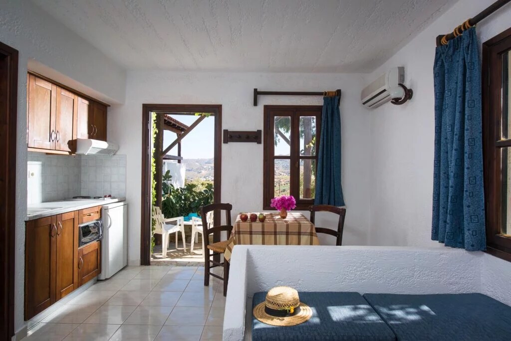Nestled in lush Mediterranean gardens, the Double Garden View Studio offers a peaceful Cretan retreat for up to two adults. Each uniquely designed studio (20–25 m²) features a comfortable double bed, kitchenette, sitting area, and private bathroom. Enjoy your furnished patio or balcony surrounded by flowers and olive trees. Relax by the shared pool or explore the estate’s vineyards—where serenity and authentic Cretan charm await.