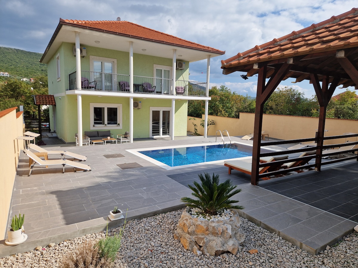 Este alojamiento con estilo es perfecto para viajes en grupo. En el alojamiento puedes encontrar 3 apartamentos totalmente equipados con su estilo único. La casa está reformada con artesanía local y materiales antiguos como piedra, madera de olivo y fregaderos de piedra. Está hecha como nuestros antepasados hicieron sus casas, pero con un toque de lujo con 5 dormitorios y 5 baños. La casa cuenta con una elegante piscina privada, diferentes terrazas y barbacoas de piedra. Es un lugar tranquilo y apacible en medio de la bahía de Kotor.