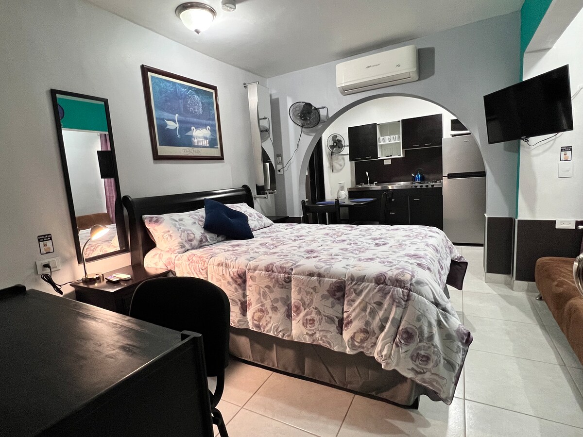 Excelente ubicación, departamento céntrico recién remodelado. Cuenta con cama matrimonial muy cómoda, cocina, internet de 200 megas, smart tv, cocina equipada y baño completo. Ubicación inmejorable! A la esquina de la calle se encuentra un súper donde puede hacer su mandado, a una cuadra se encuentra un deportivo muy bonito para hacer ejercicio y correr, a cuadras de hospitales, farmacias, papelerias y de vías principales! SE FACTURA Déjame saber como te puedo ayudar, me encantará hospedarte.