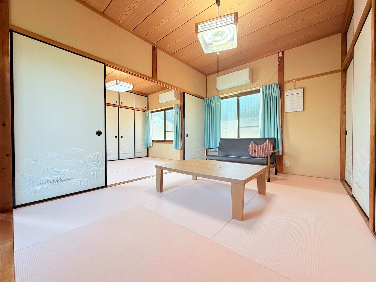 築50年の古民家で田舎のおばあちゃん家に遊びに来たような感じでのんびりお過ごし下さい。サーフィンやゴルフ後にお庭でBBQをして過ごしたり、天然地下水の水風呂(年中14℃)を併設したサウナ体験(別途料金)をしたり、ペットと中庭で遊び、夜は素敵な星空を見たり、大型スクリーンで映画鑑賞を楽しむなど、和のお部屋でおくつろぎ下さい。 飲食店迄車で3分、スーパー迄車で15分 海迄徒歩10分(遊泳不可) 新日サーフポイント迄車で20分 不便な場所ですが、徒歩で神社詣りしたり 車で5分で菜の花祭りやカフェも行けます BBQ七輪2名用1000円、BBQコンロ3.〜4名様用1500円、5〜6名様用2000円、7〜9様用2500円のご利用料金がかかります。詳細は下記その他の留意事項をご参照下さい。 サウナ一棟を90分使用でご利用料金¥4000で、水着バスタオル等ご持参下さい。 BBQとサウナはメッセージで事前予約でご利用料金は当日現金かPayPayで支払いをお願いします。 Wワークの為、対応にお時間がかかる事がございますが、どうかご了承下さい。 皆さまとの出会いを楽しみにお待ちしてます。