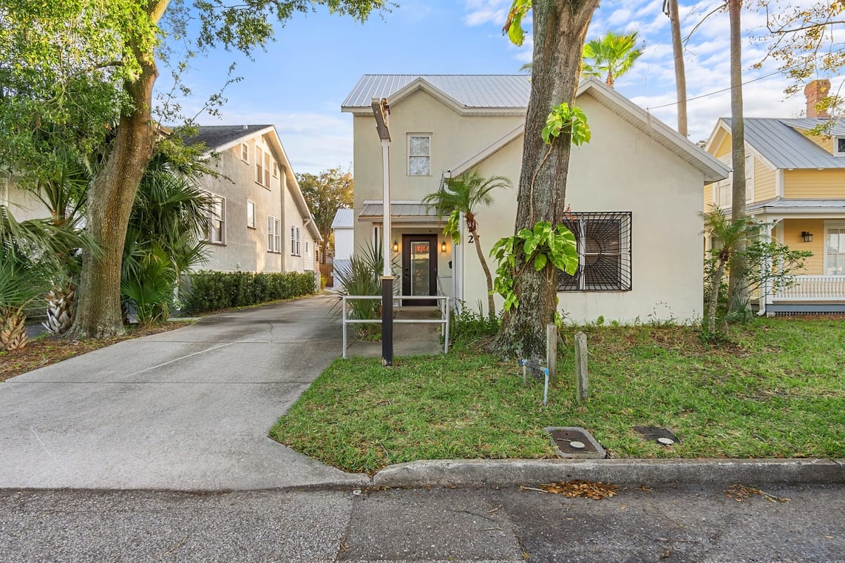 Nuestro alojamiento está cerca de la vida nocturna, el transporte público, el aeropuerto, la plaza de la ciudad y los parques. Es bueno para parejas, aventureros solitarios, viajeros de negocios, familias (con hijos) y amigos peludos (mascotas). A cinco minutos a pie de las "Noches de las luces", a dos minutos a pie del campo de eventos de Francis Field, donde se celebran muchos festivales, conciertos y actividades. A cinco minutos en auto de la playa oceánica de Vilano. Muchos restaurantes y bares a poca distancia a pie, incluyendo bar deportivo, bar martini, pub irlandés y más.