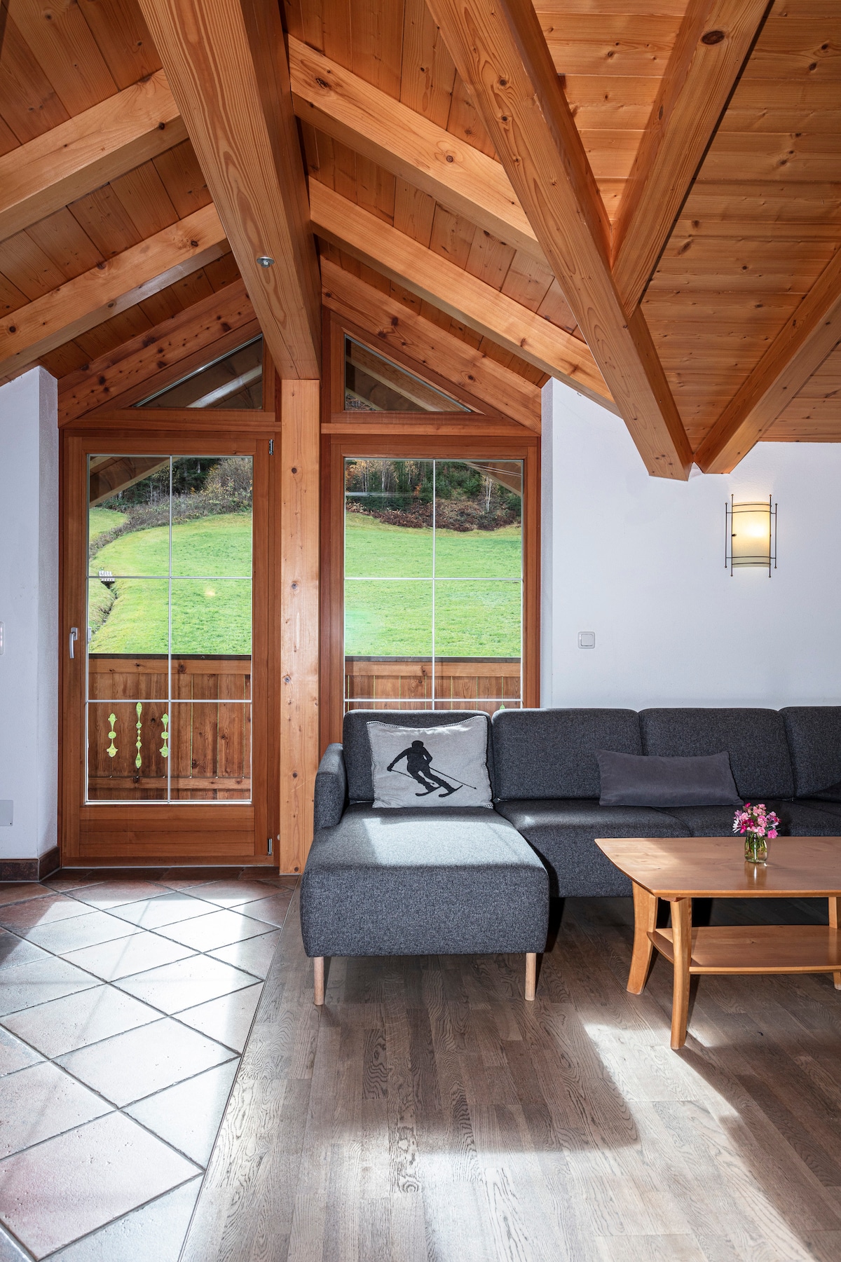The luxurious 200-square-meter chalets are furnished with great attention to detail. The furnishings, made with the highest quality materials, combine modern design with an Alpine feel-good ambiance. Each chalet extends over three levels with two terraces and a balcony and can accommodate 8 to 10 people. From every floor, you can enjoy panoramic views of the Tyrolean mountains. The four bedrooms each have a separate bathroom. The shared living and dining room with a fully equipped, open-plan ki