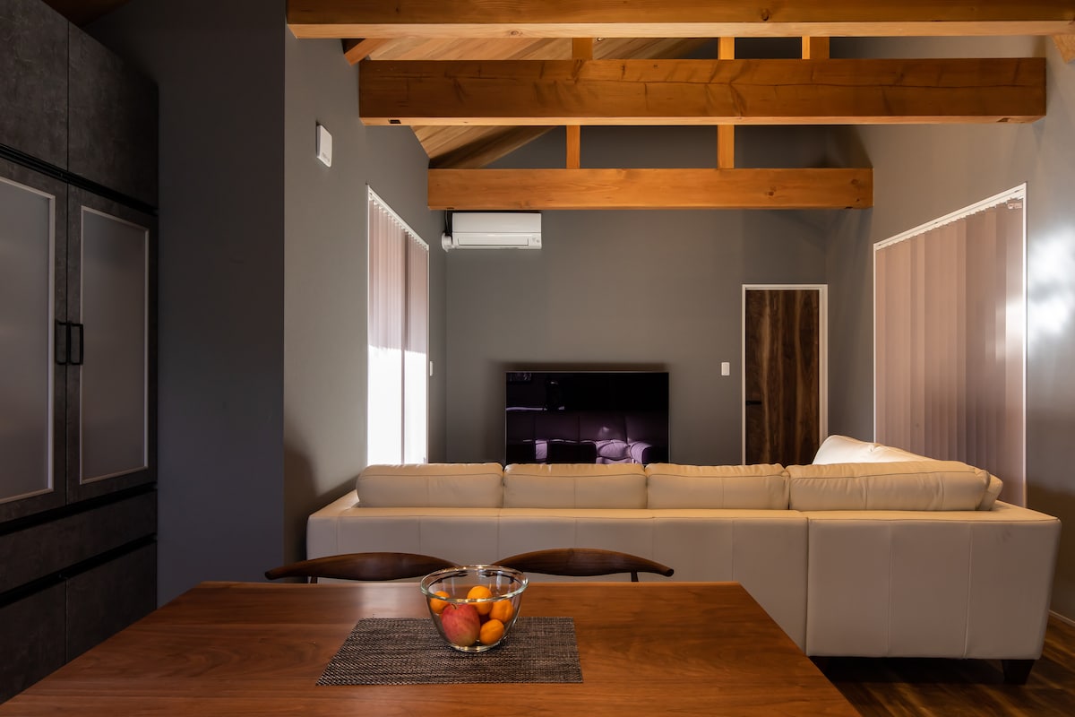Es una habitación que responde a las solicitudes de huéspedes extranjeros a nuestra manera original. La gran ventana del baño juega un papel de marco artístico con vistas a la vegetación fresca, las hojas de otoño y la nieve. El baño de ciprés Kiso negro azabache hecho a medida es una característica distintiva de la habitación "moderna y fresca". La cocina y la lavandería también están organizadas funcionalmente para estancias largas.