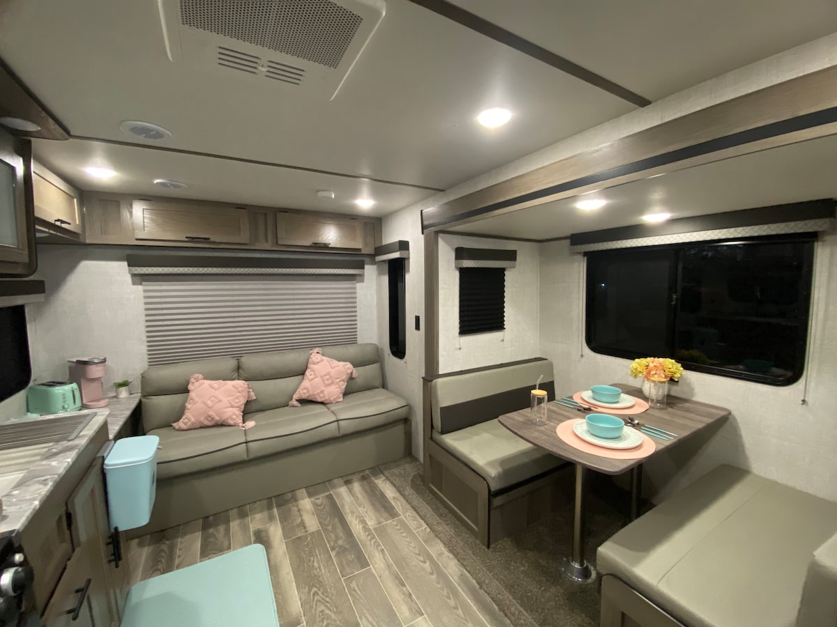 Autocaravana 2024 completamente nueva. Una habitación principal con cama tamaño queen, 1 baño, una mesa de comedor que se puede convertir en una cama adicional para una persona y tal vez un niño (dependiendo del tamaño de la persona), aparcamiento personal, entrada y wifi. Cerca del centro comercial Sawgrass y del estadio en vivo Amerant Bank.