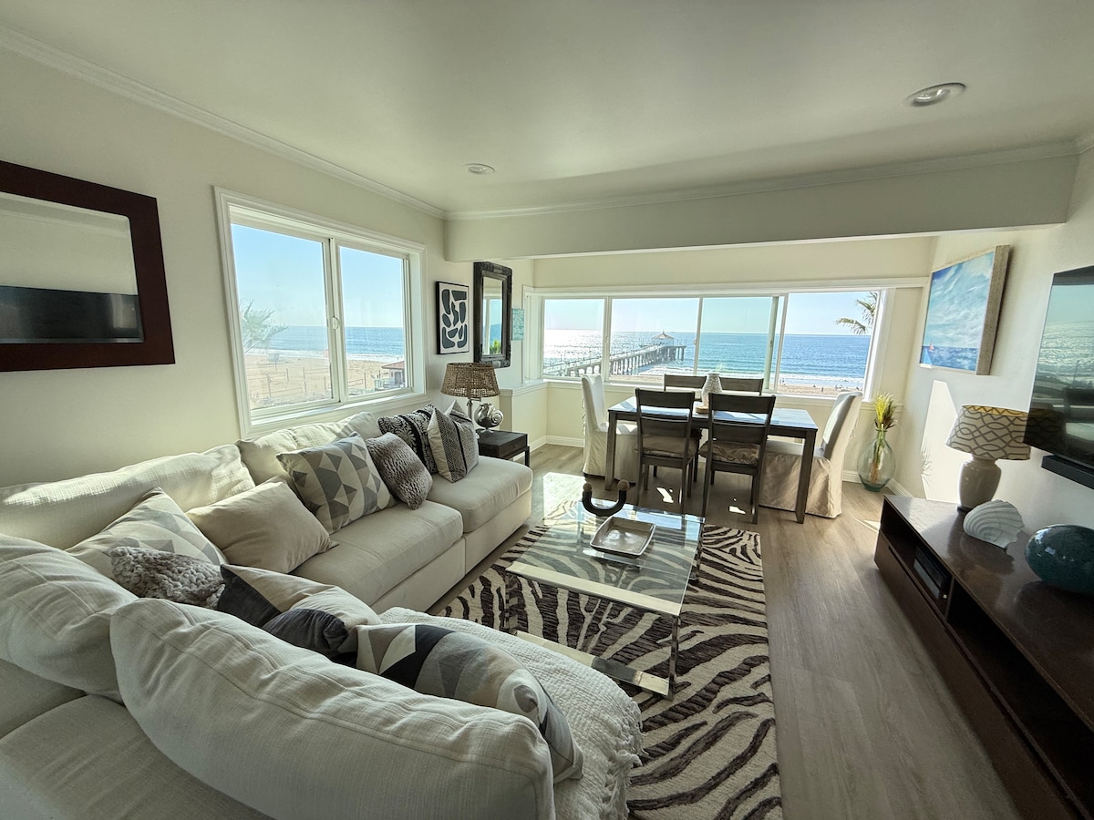 ¡Vistas al mar y sol! ¡A unos pasos de la arena! Disfrutá de los amaneceres y las puestas de sol en tu terraza. Bienvenido a su unidad de primer piso recién remodelada frente a la playa en Hermosa Beach. Espacio habitable de concepto abierto. Moderno alojamiento de 2 dormitorios y 2 baños completos con Internet de alta velocidad, chimenea eléctrica, dos televisores inteligentes, lavadora y secadora en la unidad y cocina de chef. Literalmente en la playa. Acceso a paseos en bicicleta, patinaje, surf, voleibol, vela, tiendas, cafés y restaurantes populares.