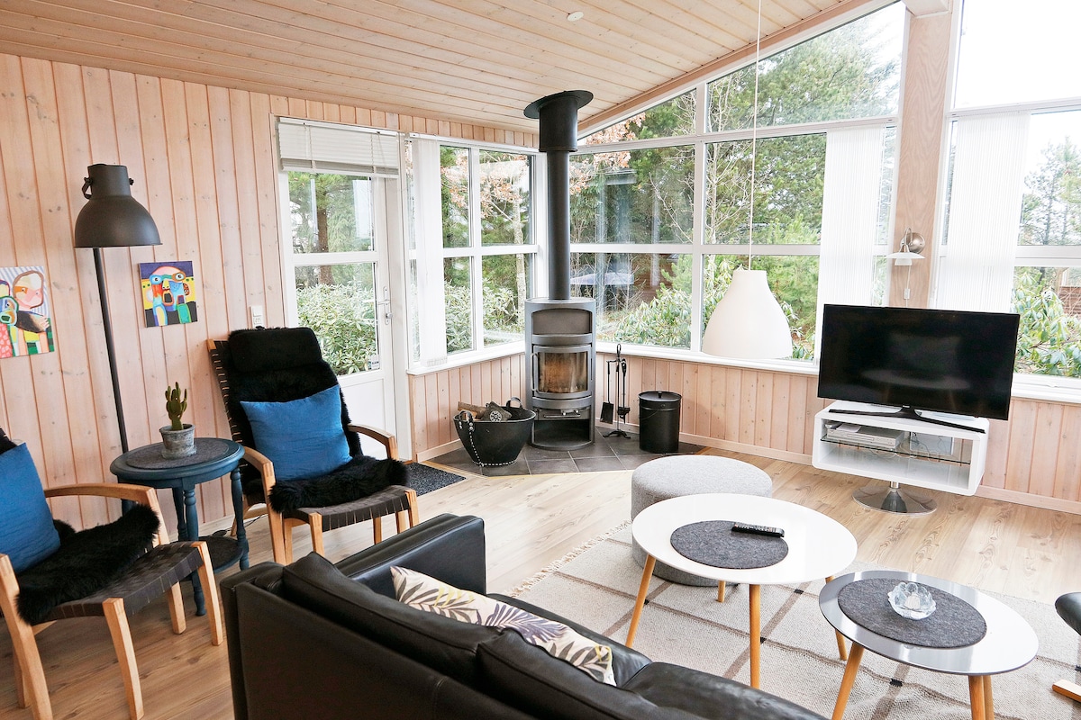 Hyggeligt veludstyret træhus med panoramaudsigt over fjord og gå afstand til Vesterhavet (1500 m). 106 kvm hus, 3 soverum. 2 værelser med dobbeltsenge, 1 med 2 enkelt senge, 2 badeværelser med brusebad. Veludstyret køkken. 3 terrasser, en overdækket med gas grill . Varmepumpe og brændeovn. Tv, parabol, radio, wifi. Der er vildmarksbad og sauna med fjordudsigt. El afregnes med aktuel dagspris pr.kWH , der sendes anmodning gennem Airbnb ved afrejse.
