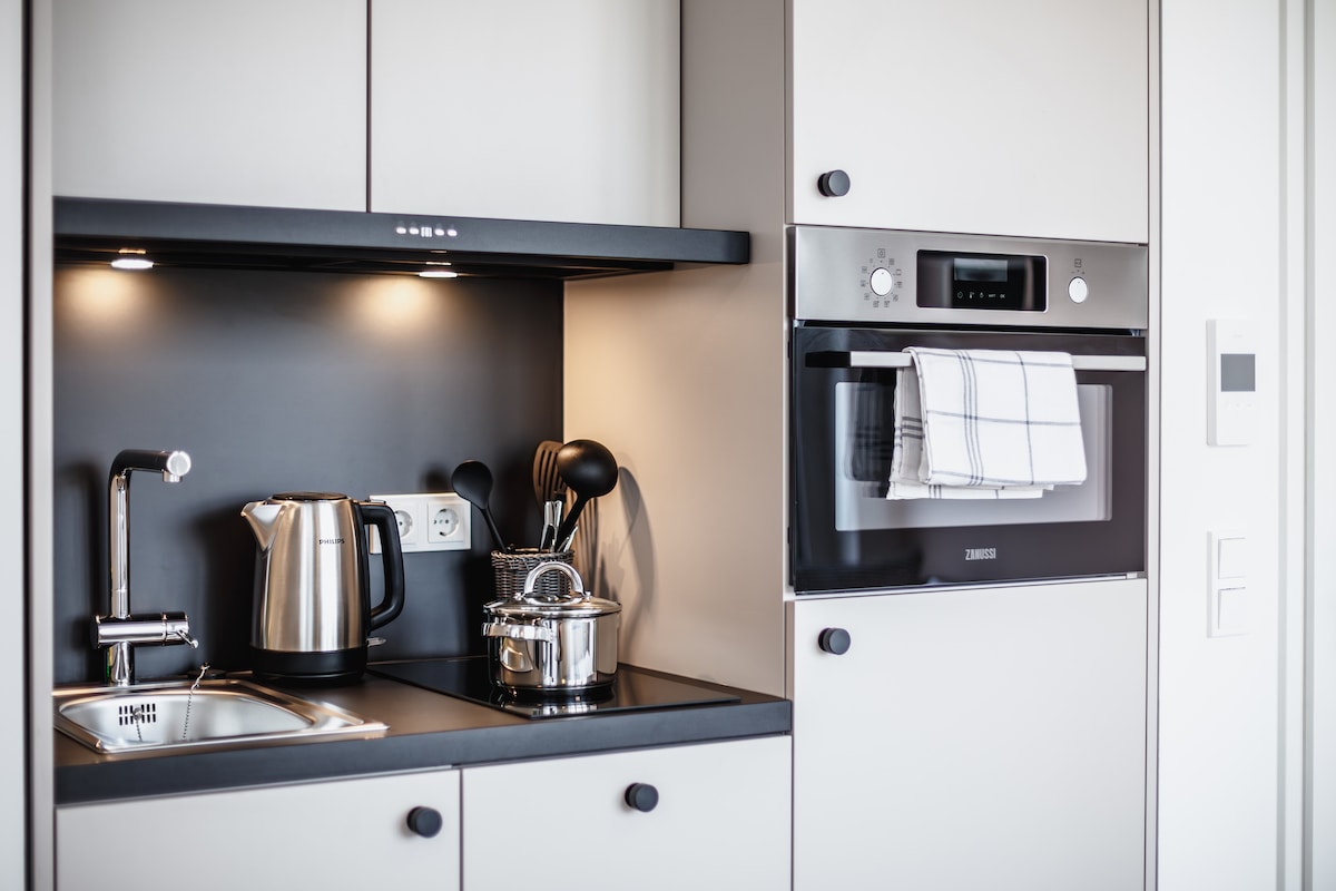 ¿Una escapada a la ciudad o una estadía larga? Con todo lo que necesitas para vivir, estos elegantes estudios de 22 m² están diseñados de manera inteligente, con texturas naturales y acabados únicos. Tendrás una cómoda cama tamaño king de 150 cm x 200 cm en el Reino Unido, un escritorio para trabajar, una cocina pequeña para cocinar sin esfuerzo y un baño moderno. ¿Tienes lavandería? La lavandería comunitaria es tuya para que la uses como quieras. Descargo de responsabilidad: puede que el apartamento de la foto no sea el que te quedas.
