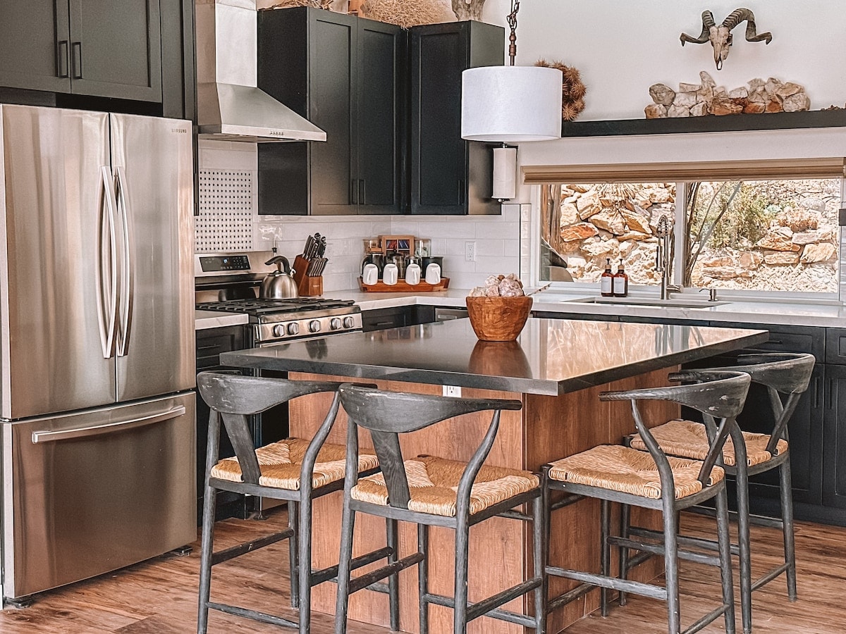 The Rum Runner. Una versión moderna del clásico granjero del desierto. Los aspectos más destacados incluyen: - Bañera caliente. - Parrilla. -Tesla Charger - Múltiples fogatas - Sábanas de jaula. -Son Sound System - Vistas ininterrumpidas al desierto - Bañeras de vaqueros múltiples - Cocina totalmente equipada. - Sofá cama al aire libre para contemplar las estrellas. - Gran patio a la sombra con comedor al aire libre. - Habitación soleada con pared de vidrio retráctil de 8x20’ - Mural interior diseñado por la artista local Ana Digiallonardo.