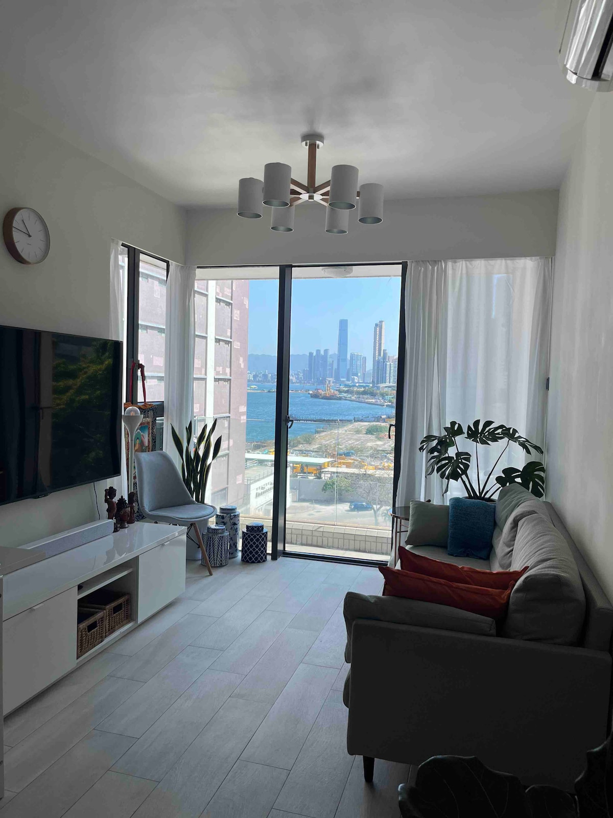Apartamento de lujo con terraza y vista al mar para 4 personas en Hong Kong (piscina y gimnasio gratuitos/cerca de la estación de metro de Olympic/acceso directo a Disney/proyección de pantalla gigante/cocina)