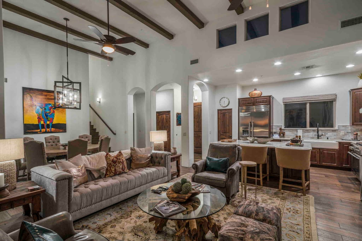 Welcome to The Hidden Hacienda Scottsdale! A fun, whimsical retreat with cowboy-chic decor, pool, spa, karaoke, and games—perfect for bachelorettes, families, or golf getaways. Sleeps 10 with comfy beds, smart TVs, a pool table and a fully stocked kitchen. Lounge beneath swaying palm trees, practice your swing on the mini putting green, or unwind in your private backyard oasis with cozy seating fire-pit and outdoor tv. Minutes to Kierland Commons, top golf courses, Spring Training and more!