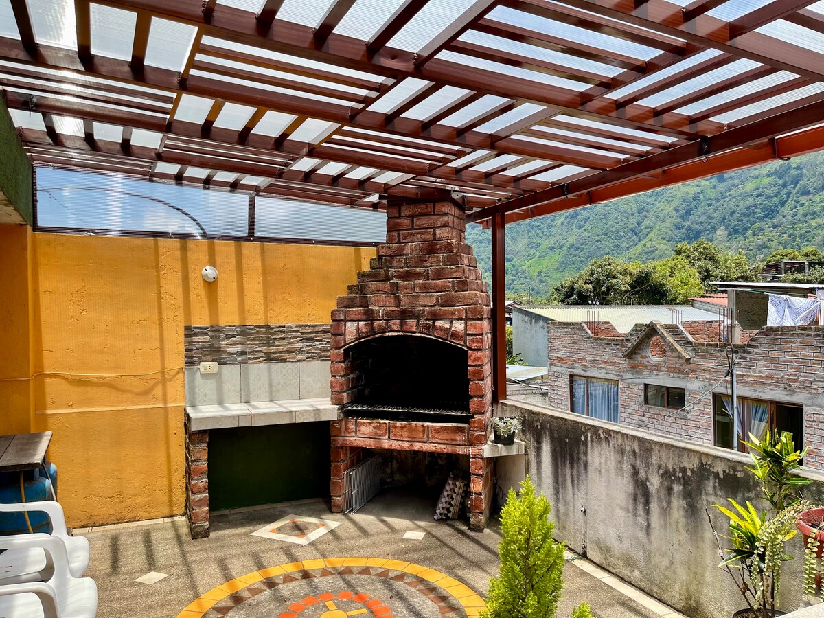 Incluye el desayuno de la casa, muy valorado por nuestros huéspedes. Casa independiente, confortable y segura, con vista al volcán Tungurahua y a cinco minutos del centro de la ciudad, muy cerca de restaurantes, cafeterías, parques y de toda la oferta turística que encuentras en Baños, un rincón andino rodeado de cascadas y montañas llenas de encanto y paisaje. Ideal para viajes de descanso, entretenimiento o trabajo en casa, en un entorno natural y único. Siempre será un gusto atenderles.