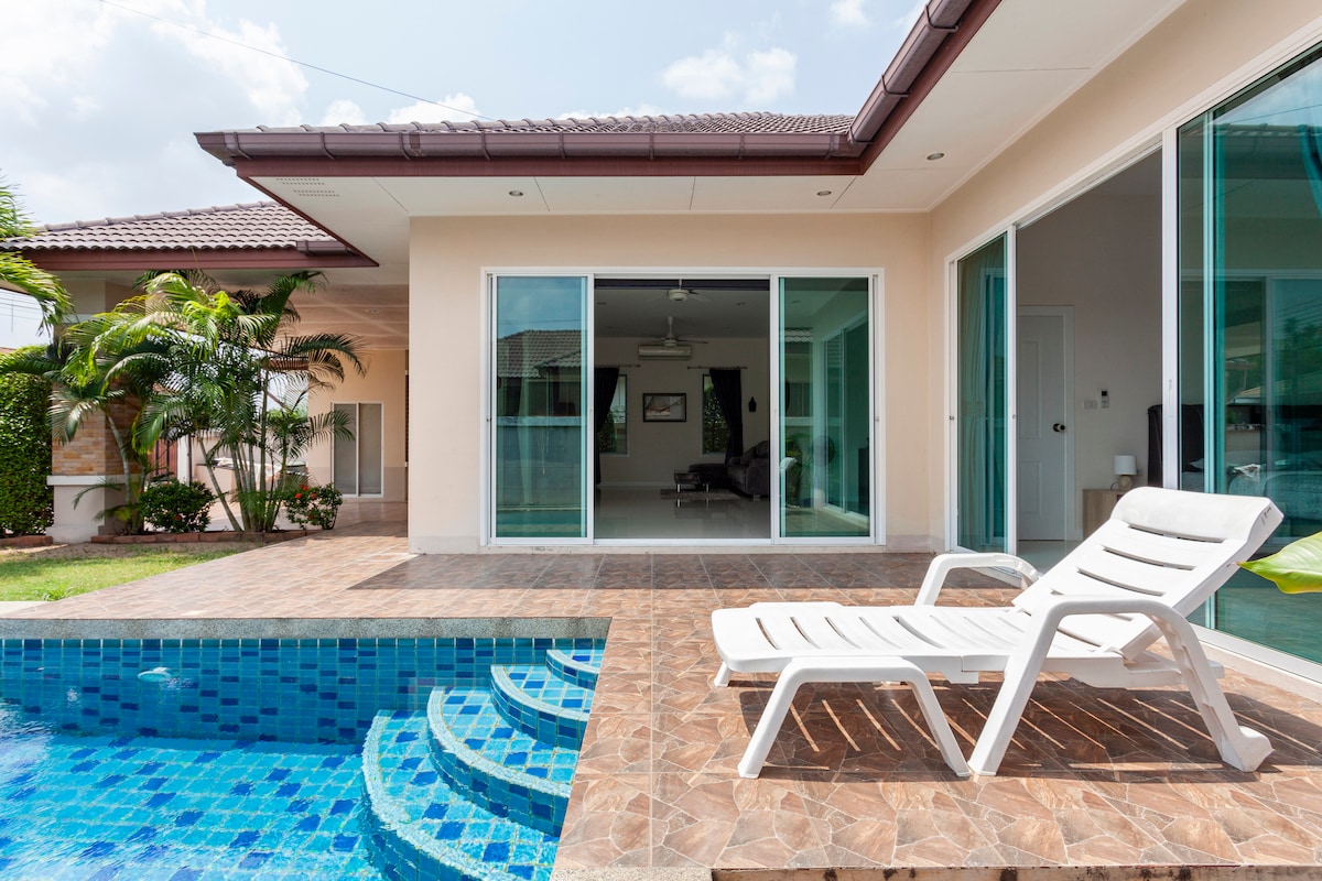 🌴 Your private pool villa getaway, near Siam Country Club.🏌♀️ -3 bedrooms 3 bathrooms (2 King, 2 Twin) -Utilities included -Private Pool -Pool cleaning (2x a week) -WIFI (Hi speed) -Smart TVs (living 65"/master 55") -Board Games & Karaoke -BBQ grill -Equipped Kitchen -Blackout curtains -Washer/Dryer -Fresh Towels -Shampoo/Conditioner/Soap -25 min. drive to Jomtien Beach ❤️ Perfect for family vacation, nature-lovers, quiet nights, & longer stay. ⭐️SPECIAL weekly & monthly price Book now❗️