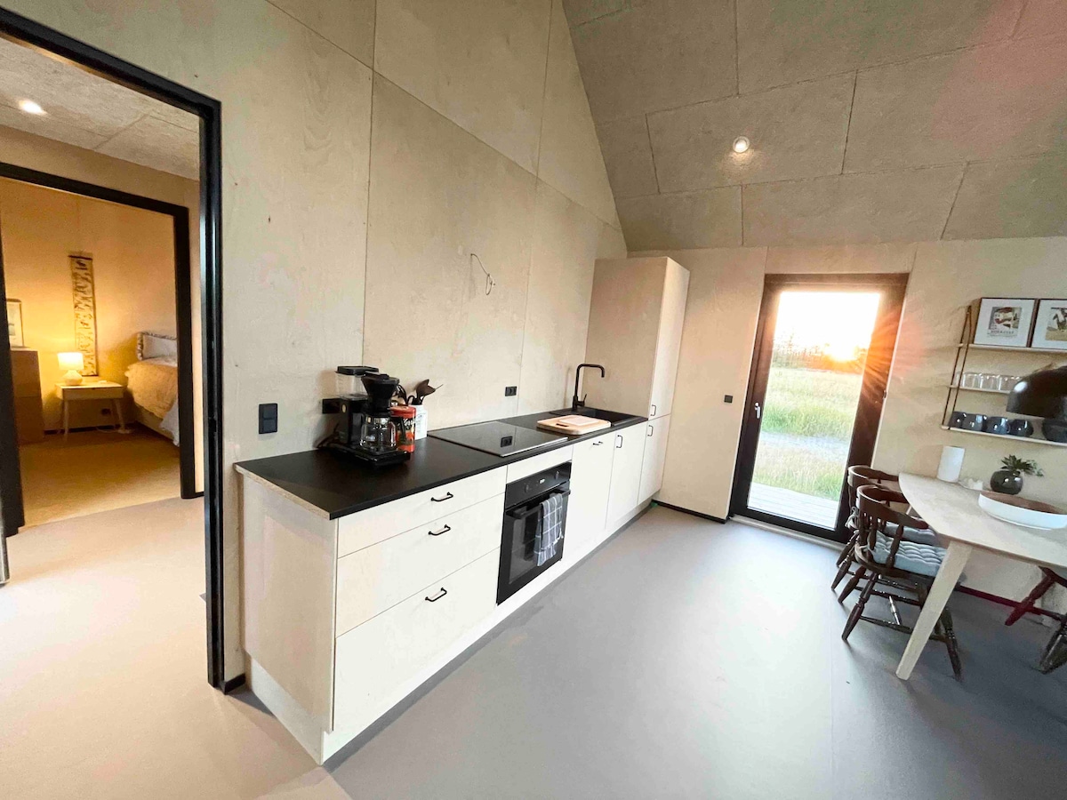 Disfrute de sus vacaciones en una de nuestras 8 hermosas casas pequeñas. Desde la cama doble tiene vistas al fiordo y al idílico puerto de Bjerregård. Puede preparar su propio desayuno en la pequeña cocina con 2 fogones y utensilios de cocina, o puede pedir el desayuno con nosotros (con un coste adicional) Disfrute del amanecer con un café caliente humeante ante la vista de miles de aves migratorias en la reserva de aves Tipperne. Si quieres ir al Mar del Norte, está a solo 15 minutos a pie. La ropa de cama y las toallas están incluidas en el precio.