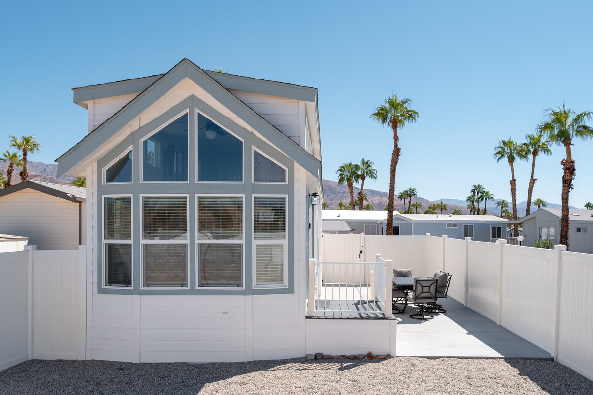 Live it up, and take it easy at this unique and tranquil getaway! Located in a remote hot springs gated resort, this is a tiny house/RV, manufactured home community. Relax in healing mineral pools and hot tubs, just two blocks away! Enjoy all the resort's amenities. Hike nearby, or drive to Joshua Tree National Park. Explore Palm Springs, 25 miles away. Take an evening walk through this friendly community. And after a perfect day, watch ducks in the pond and sunsets on the mountains!