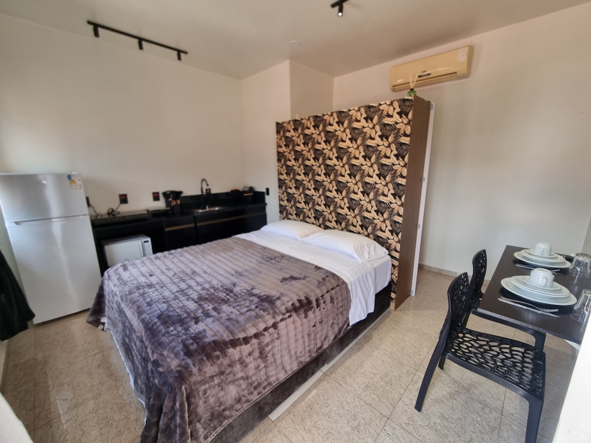 Estudio estilo habitación de hotel ubicado en el centro de Guarapuava con estacionamiento cubierto. Este estudio no tiene cocina, está destinado a personas que no planean cocinar en casa. El estacionamiento cubierto es de cortesía. Alquilamos por un mínimo de 2 noches. Para alquileres de al menos 1 semana hay un 20% de descuento y para alquileres mensuales hay un 40% de descuento. Supermercados: 4 cuadras Gasolinera, farmacia, restaurante y cafeterías: 1 cuadra. No se permiten fiestas.