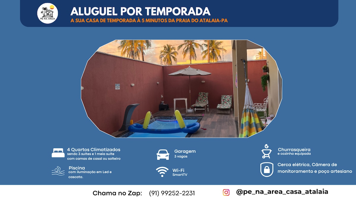 Casa ideal para famílias, localizada na rua do antigo pedalinho, próxima ao Ed. Dunas. Ela possui 4 suítes, todas com ar condicionado, chuveiro elétrico e TV de tela plana. Wi-Fi. Banheiro social. Cozinha completa, com todos os utensílios necessários. Casa toda mobiliada. Dispõe de piscina e churrasqueira. É equipada com vigilância 24h. Cerca elétrica. Vaga para 4 carros. Portão eletrônico. Poço artesiano.