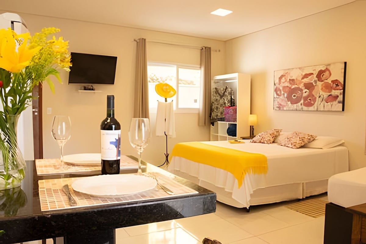 Encantadores estudios independientes en la hermosa playa de Prumirim. Entrada independiente, patio privado, cocina totalmente equipada, cama queen size de alta calidad, cómoda sala de estar. Todo diseñado con calidad, comodidad y estilo. ¡Grandes ventanales panorámicos que te harán sentir entre las copas de los árboles! Este es un lugar mágico para aquellos que buscan una escapada romántica junto al mar conectándose con la naturaleza sin comprometer su comodidad. ¡Todo meticulosamente limpio, desinfectado y seguro!