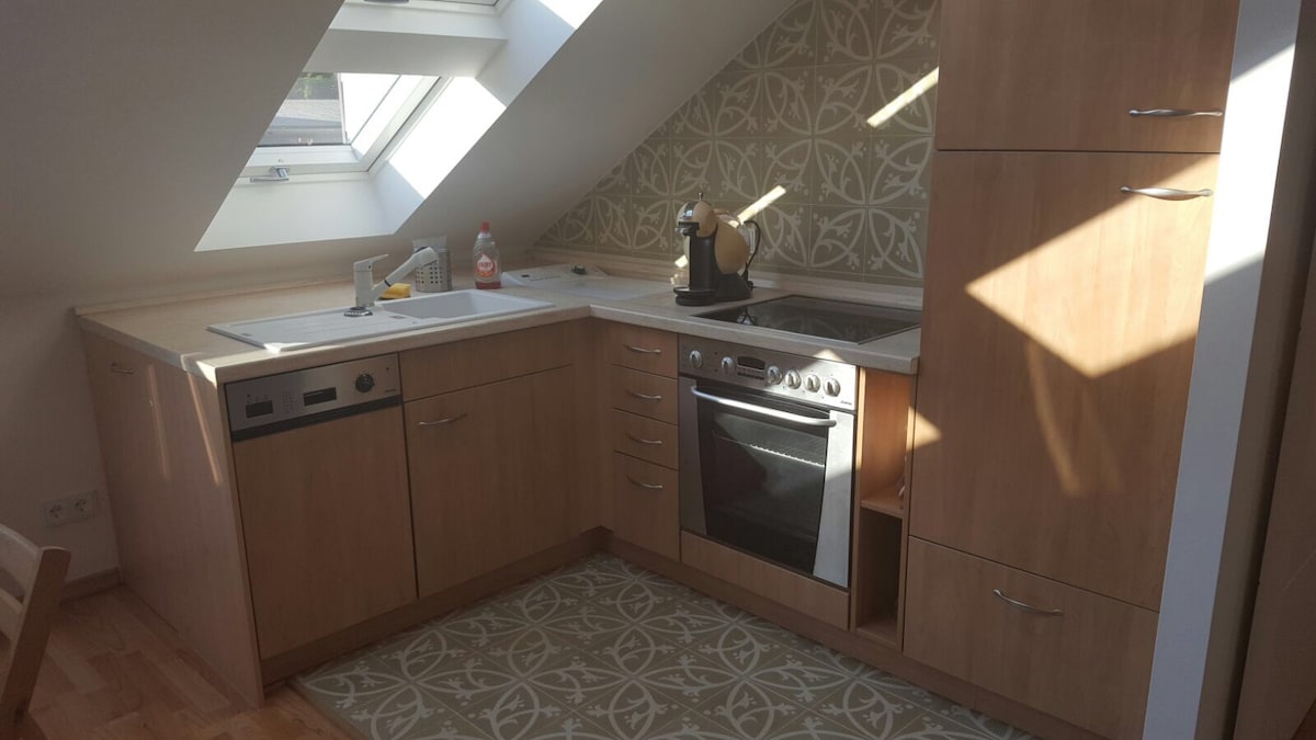 Modernes, großzügiges Studioapartment mit abgetrenntem Badezimmer. Ein großes Kingsize-Bett (2m x 2m) mit hochwertigen Matratzen gibt es im durch einen Raumteiler abgetrennten Schlafbereich. Eine bequeme Wohnlandschaft bietet im ausgezogenen Zustand (1,40m x 2,00m) einen Schlafplatz für eine dritte Person. Die Küche ist voll ausgestattet mit Induktionskochfeld, Backofen, Kühlschrank mit Gefrierfach, Senseomaschine. Achtung: Nicht geeignet für gehbehinderte Personen! Dachgeschoss, kein Aufzug!