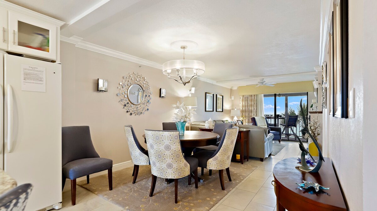 Las vistas más impresionantes desde este nuevo condominio directamente en Treasure Island Beach. Este encantador alojamiento se encuentra en el cuarto, quinto o sexto piso y ofrece vistas panorámicas del mar. Esta unidad tiene 2 dormitorios y 2 baños completos. La acogedora sala de estar de concepto abierto tiene una de las mejores vistas del océano, especialmente cuando se abren las puertas correderas retráctiles. La mesa del comedor en tu balcón privado proporciona un comedor perfecto, con el océano que proporciona un hermoso telón de fondo.