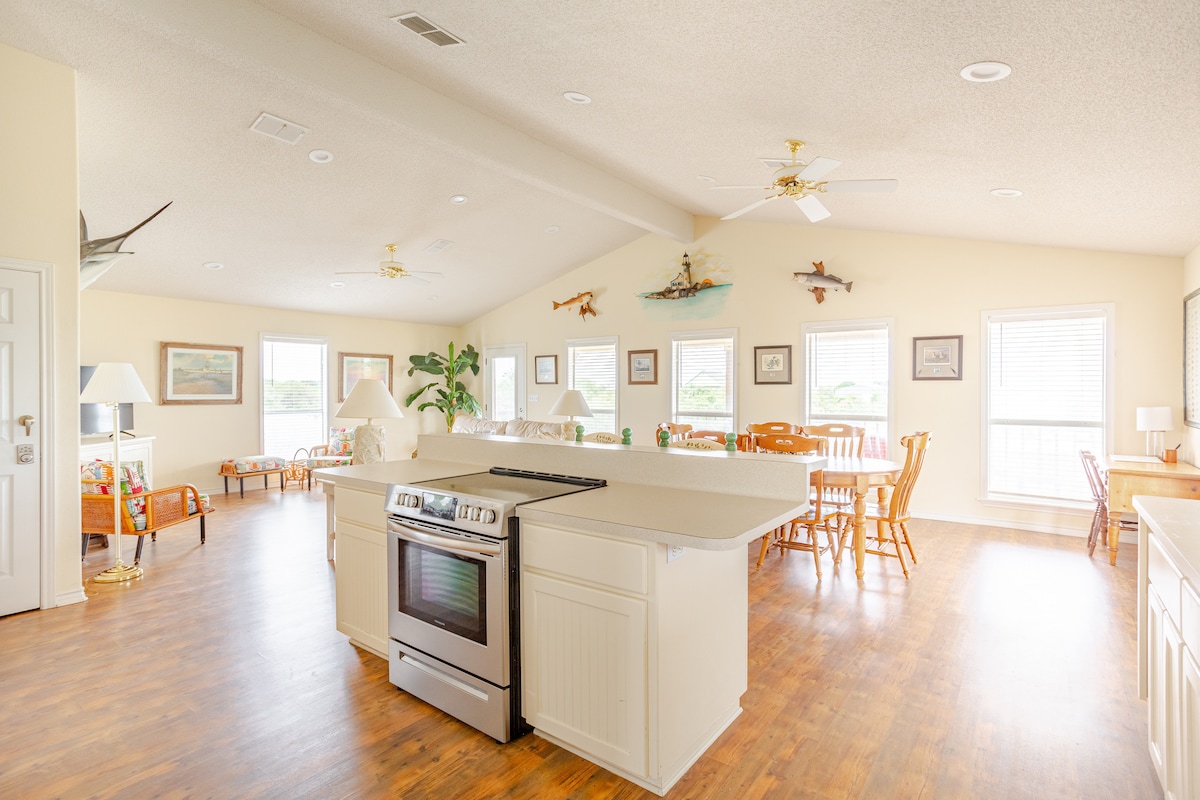 ¡3/4 acres en Keller Bay! ¡Muelle de pesca privado iluminado con luces verdes y hermosas vistas al atardecer! ¡Escapada privada lo suficientemente grande para toda la familia! La casa tiene wifi y aplicaciones de televisión para ver el juego o ver una película. ¡Excelente pesca, excelente caza de patos! Casa recién remodelada con todos los arreglos. Garaje para guardar todo el equipo durante tu alojamiento. Lavadora/Secadora, a minutos del lanzamiento del barco y del parque público. A 10-15 minutos del puerto de Lavaca. Por lo general, 3'-4' de profundidad al final del muelle durante todo el año. (Clima pendiente)