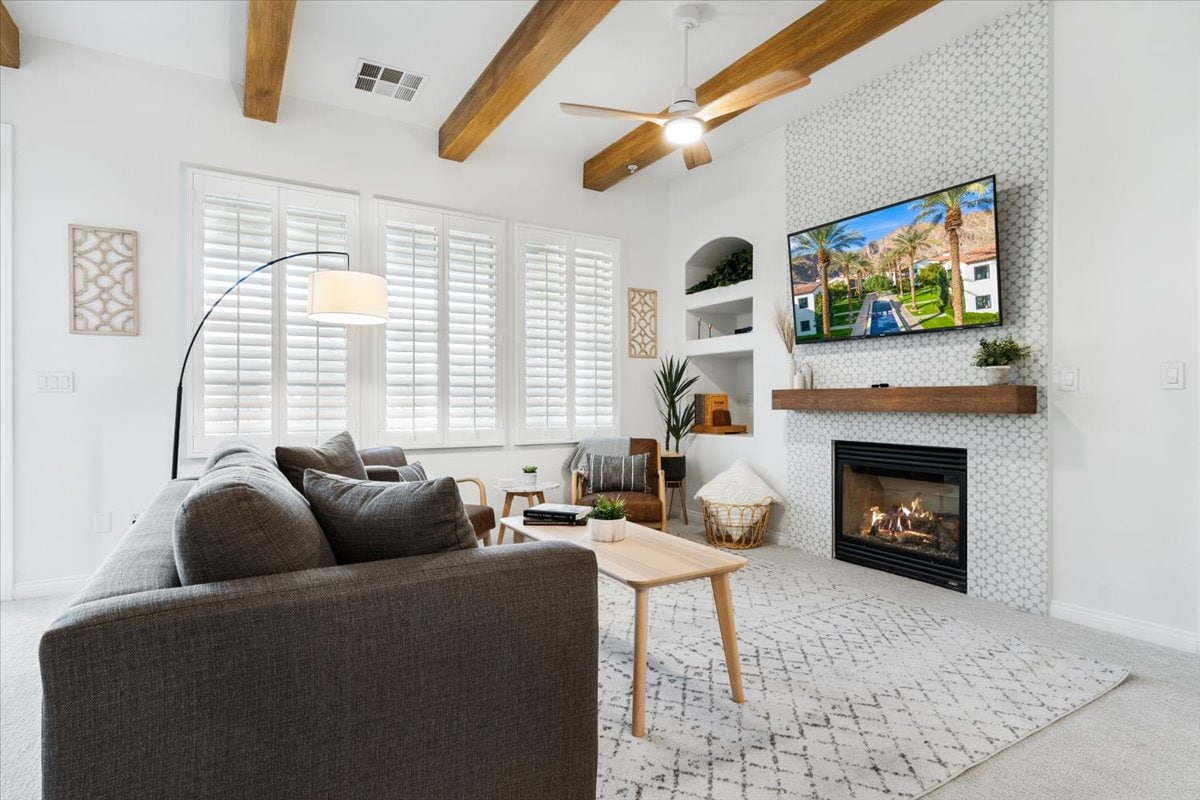 The Legacy Palms is a newly renovated, spacious & bright 2 bedroom, 2 bath condo with a modern California-desert vibe. French doors open to a large private balcony with dining and sitting area, overlooking the lush villa grounds & water fountains. It features a full kitchen with new stainless steel appliances, 3 smart TV's, dining area, 2 fireplaces and pull out queen sleeper couch in the living area. The community grounds feature 12 heated pools and spas, a gym, hammocks, grills and more!