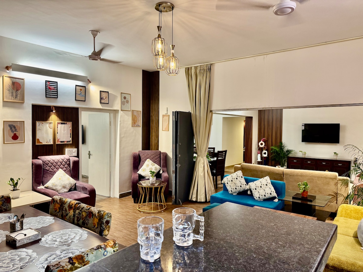 Ubicado cerca del centro comercial Garden Galleria y del centro comercial DLF de Noida, este elegante departamento de 3 habitaciones ofrece una combinación perfecta de espacio y sofisticación. Cada dormitorio está equipado con una cama tamaño queen, baño privado, mininevera y vistas a la ciudad, mientras que la sala de estar cuenta con un televisor de 43 pulgadas y un comedor para reuniones. Disfrute de una variedad de servicios compartidos, incluida una zona de juegos para actividades llenas de diversión, un salón de fiestas para eventos y una cocina compartida totalmente equipada, perfecta para preparar comidas grandes.