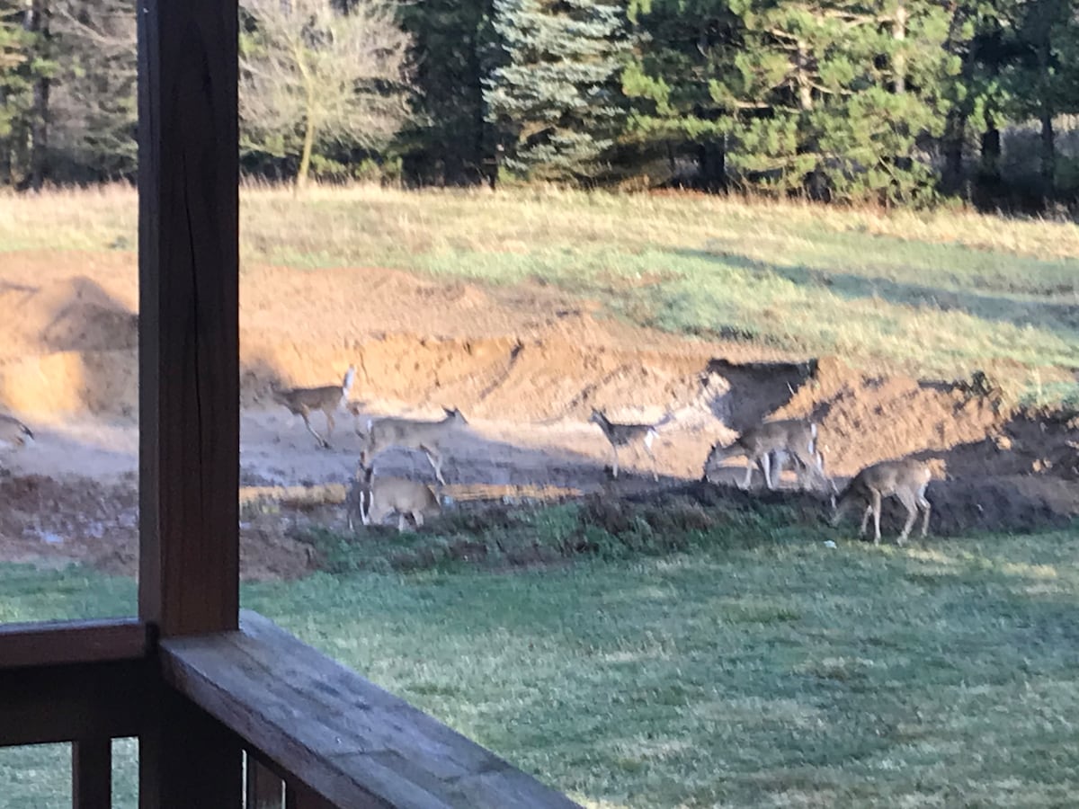 Enjoy a cozy, very private stay in the garden level apartment of our home, on a 10 acre beautifully wooded, wildlife filled, property. This is a one bedroom suite with a sleeper sofa, allowing up to four guests . The kitchenette includes a refrigerator, microwave, toaster oven/air fryer, and coffee bar, and the tv has streaming for your viewing enjoyment. WIFI and workout area to start your day! The patio area includes an eating area, and hot tub (open all year!), all very private.