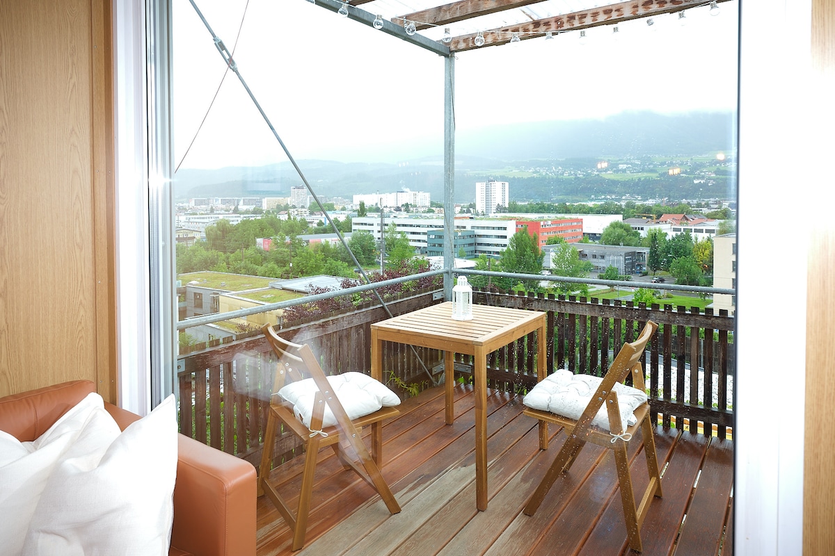 Apartamento muy luminoso (aprox. 48 m²) con balcón y vistas a todo Innsbruck. 1 dormitorio, cocina-comedor, baño con inodoro y bañera como ducha. El dormitorio tiene una persiana exterior para oscurecer. En la cocina-comedor, donde se encuentra el sofá cama para una tercera persona, hay cortinas como opción para oscurecer.