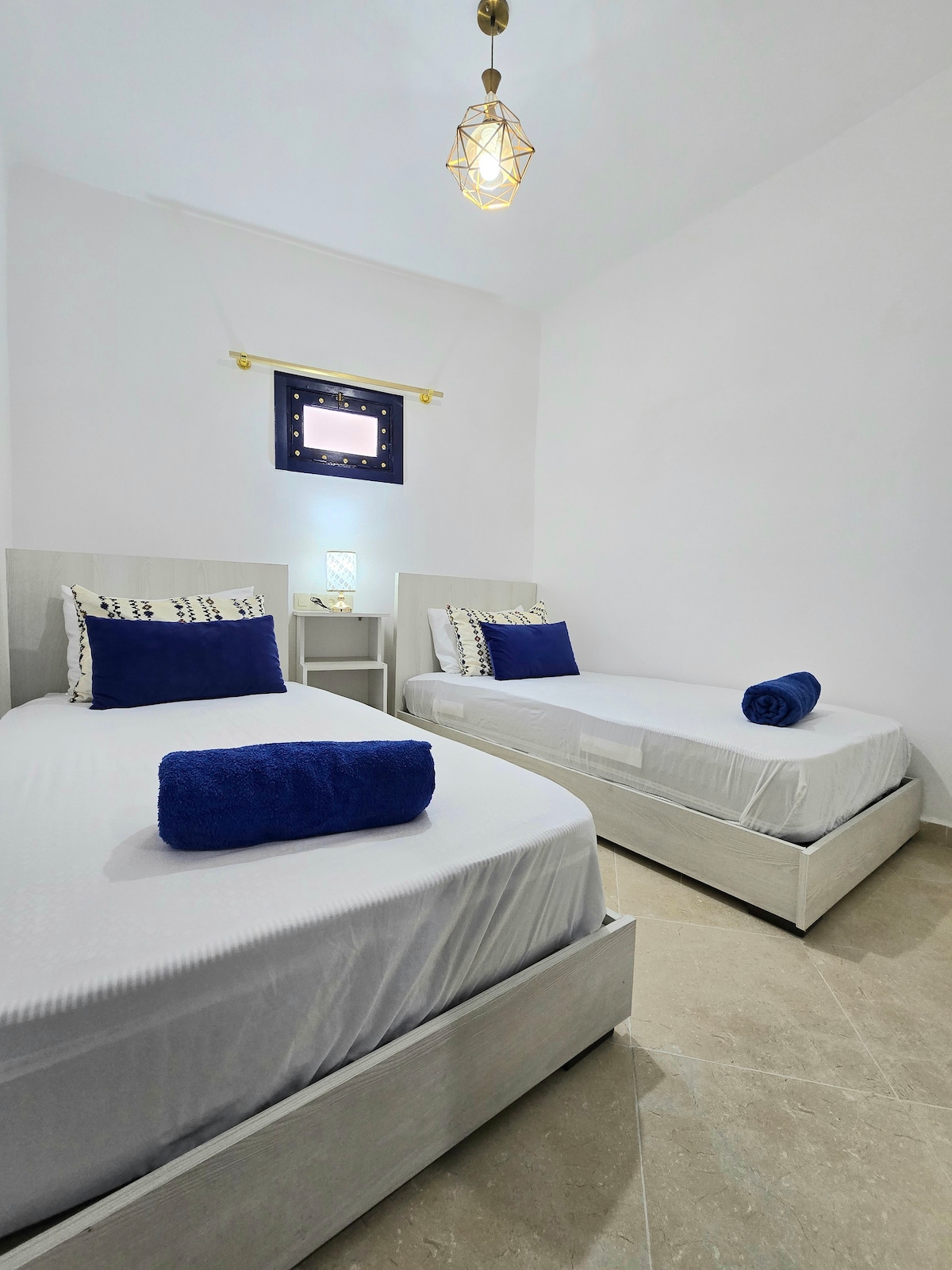 Comfortable bright small apartment just 12 minutes from the beach. Centrally located, it offers easy access to everything you need: vibrant restaurants, charming cafés, and the bustling Souk Al Had market. Ideal for travelers seeking convenience and comfort in a prime location. Please be aware that the ceiling over the stairway is a bit lower than average height. Tall guests might need to mind their heads when using the stairs.