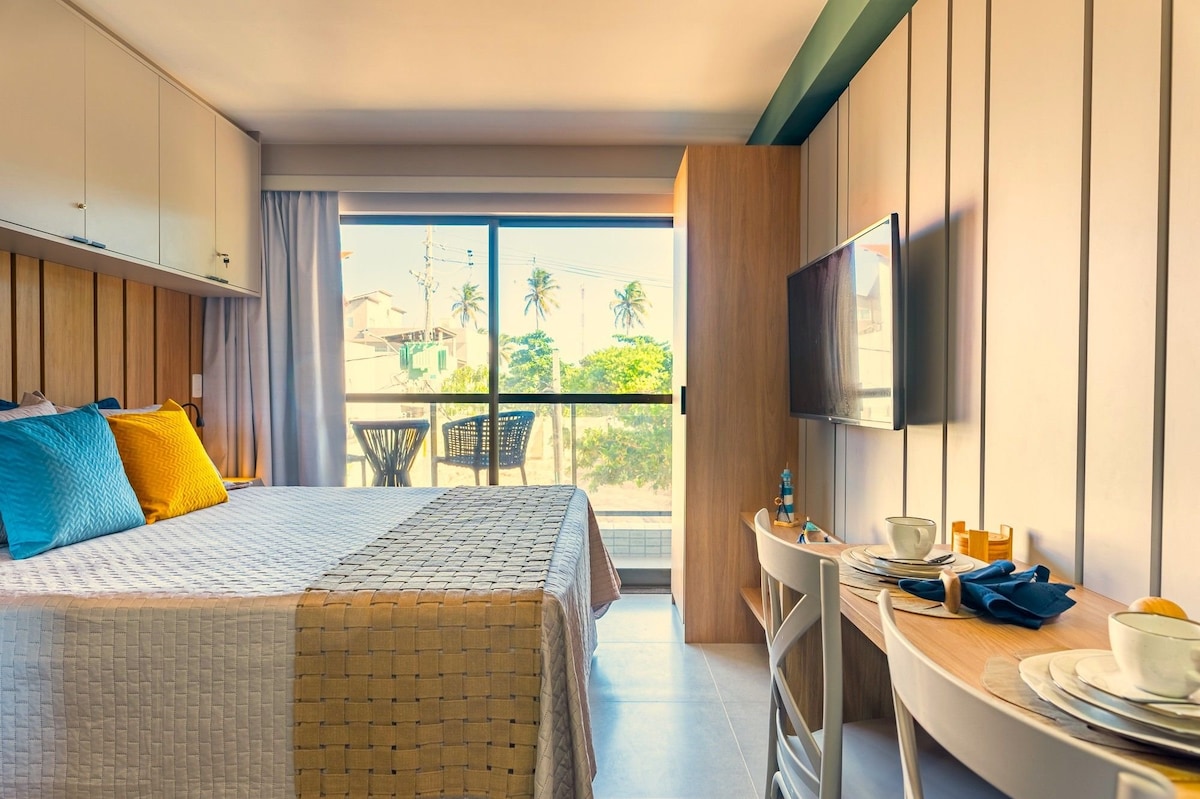 ✔️Departamento en el tercer piso frente al mar, a 20 pasos de la arena de la playa y a solo 9 minutos a pie de la famosa Rua das Sombrinhas, que se encuentra en el centro (Vilinha) de Porto de Galinhas. ✔️Balcón privado con vista al mar, aire acondicionado, TV inteligente de 55 pulgadas, pileta, gimnasio, estacionamiento rotativo. ✔️Ideal para hasta 3 personas, parejas, se proporcionan ropa de cama y toallas de baño. ✔️Mirá el amanecer sin levantarte de la cama, los días con cielo despejado y según la estación.