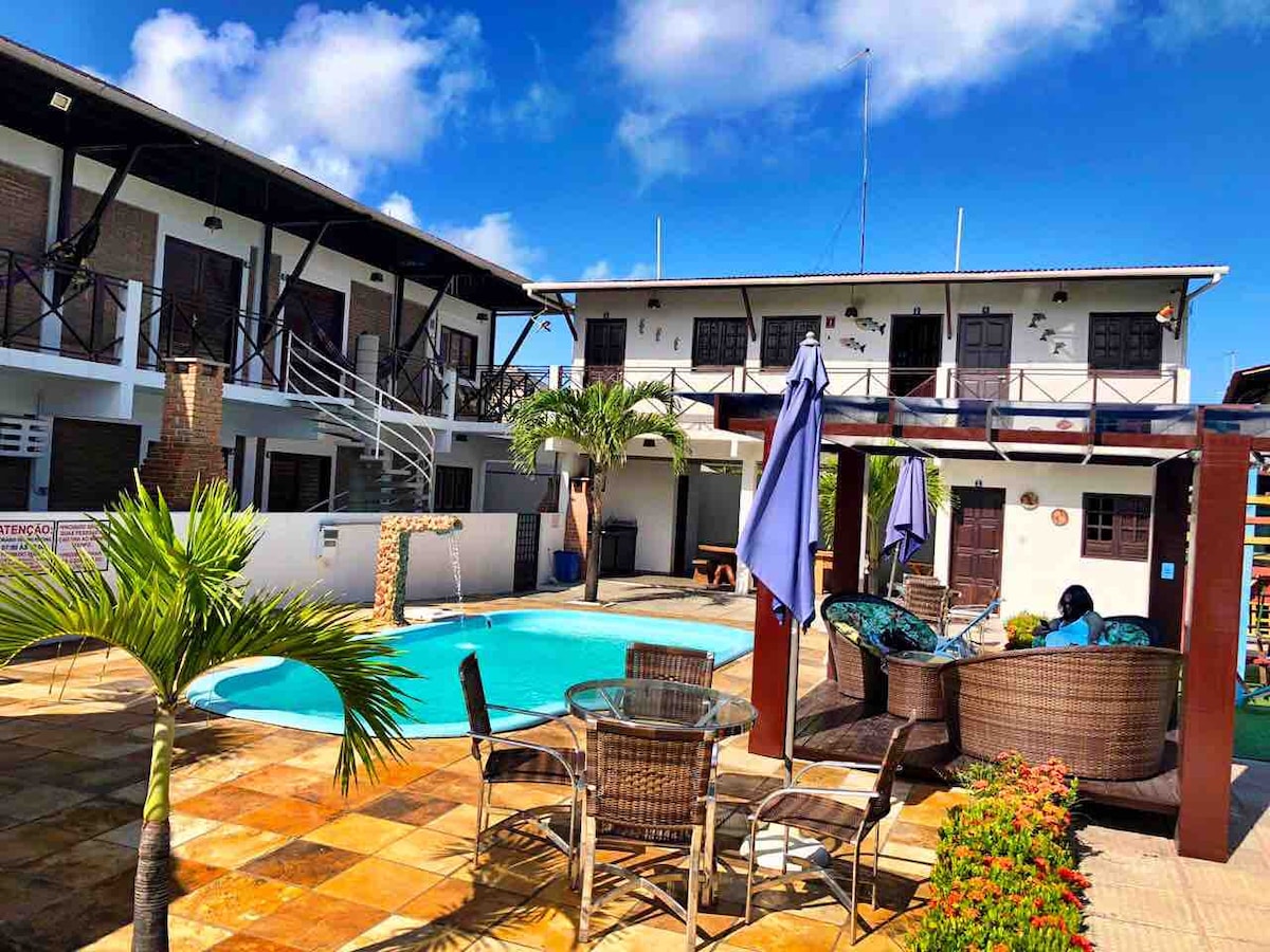 Se ubica en la playa de Porto de Galinhas - PE. en una de las playas más hermosas de Brasil. ¡Bien ubicado para la playa y Vila de porto! ¡Acogedor y boscoso! Hay 4 chalets amueblados con 40 m2 con 1 dormitorio doble y 1 social con 2 camas, ambos con sala de estar dividida con TV, despensa/cocina con utensilios y comestibles básicos para 4 personas, ¡WC con terraza y hamaca para descansar y disfrutar de momentos familiares! ¡Tenemos estacionamiento interior para 1 auto por chalet! ¡Piscina y zona de barbacoa muy bonita! ¡Échale un vistazo!