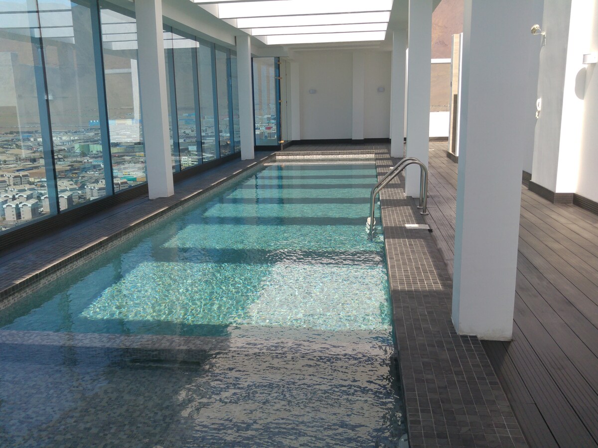 Departamento completo, amoblado, baño en suite, ubicado en el piso 15, a 2 cuadras de playa Cavancha. Cercano al Mall Plaza Iquique y supermercado Lider. A 10 mnts. de Zofri en locomoción colectiva. Cercano a Restaurante, Ideal para los amantes de la playa, con estacionamiento incluido dentro del edificio, ideal para descansar y pasar un tiempo de descanso a las orillas del Océano Pacífico.