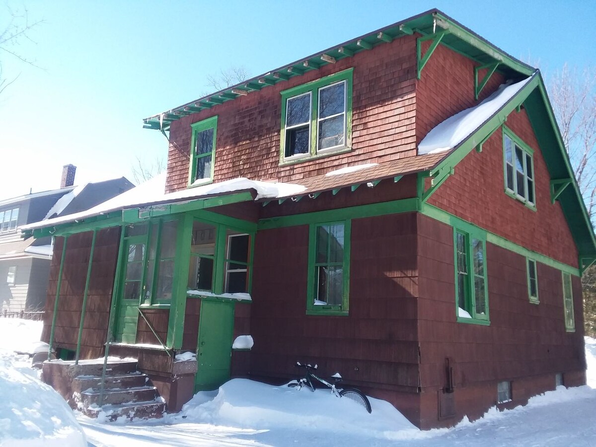 ¡Completamente remodelado de la cabeza a los pies! Situado a menos de media milla del sistema de senderos, a 2 millas de las tiendas del centro histórico, en las afueras de la ciudad (municipio de Ironwood = agua potable excelente), a pocos minutos de Big Powderhorn Mountain y Copper Peak, a poca distancia a pie de Gogebic College y Mount Zion, a 17 millas del lago Superior, gran patio privado arbolado con chimenea en verano, aparcamiento privado, 1 garaje si es necesario en invierno. ¡Un desayuno ligero de panadería incluido en tu estancia!
