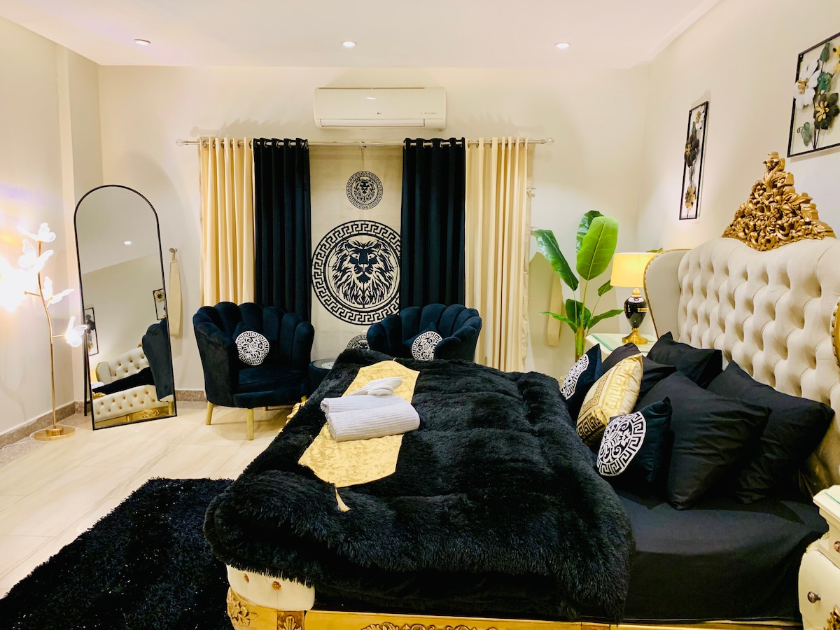 Modern, Cozy and Luxurious stay in Bahria Town Islamabad with Self-Check-in, Free Parking, Fast WiFi & Netflix enabled TV. Enjoy a King Bed, Private Balcony with Views and Seating, Kitchenette (Fridge/Freezer, Microwave and Electric Kettle), and stocked Bathroom. Breakfast and Room Service available upon request and charges. In-house café and restaurant available. Prime location near parks, malls & restaurants, just 12-15 mins drive from DHA2 and Giga Mall and under 1 hour from the airport.