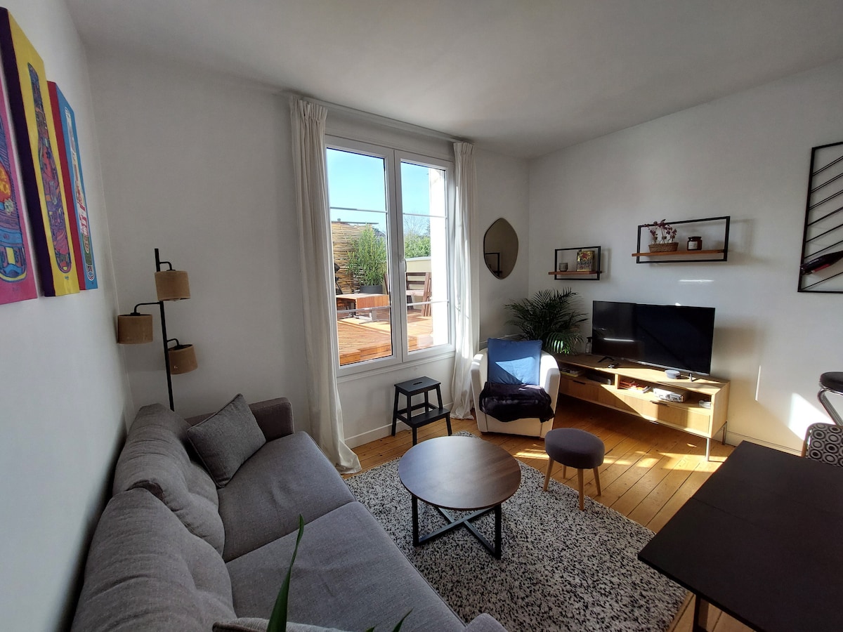 Impresionante apartamento de 60 m2 con jacuzzi en terraza de 20 m2 así como una cabina de hammam y sauna. Apartamento situado en el segundo piso de una casa, amueblado con buen gusto, gran ventanal que da a una terraza de 20 m2 con jacuzzi, tumbonas y silla colgante, cocina equipada, un dormitorio con cama doble y un gran sofá panorámico convertible para 2 personas, baño con cabina de ducha hammam/sauna. Ideal para un momento romántico y una escapada a París. * NO SE PERMITEN FIESTAS NI VELADAS