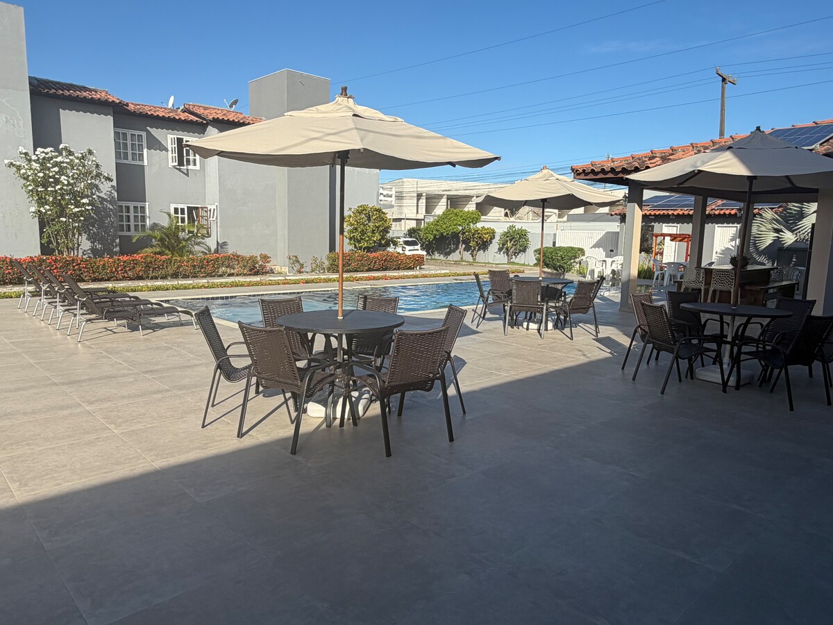 Dirección: Rua da Falésia 100, Alto da Pitinga - Arraial D'Ajuda Ubicado en el Condominio Monte das Oliras, hermoso paisajismo y una pileta monumental. Estamos a 2 km del centro y a menos de 1 km de las playas principales. Recomiendo ir en auto o alquilar, el taxi cobra caro. Departamento en planta baja de 50 m2 con área privada con parrilla, 1 suite con aire acondicionado, living con aire acondicionado, smart TV, sofá cama, 2 baños, cocina y 1 plaza de estacionamiento. Portal de acceso las 24 horas, gimnasio con aire acondicionado, sauna y piscina con hidromasaje