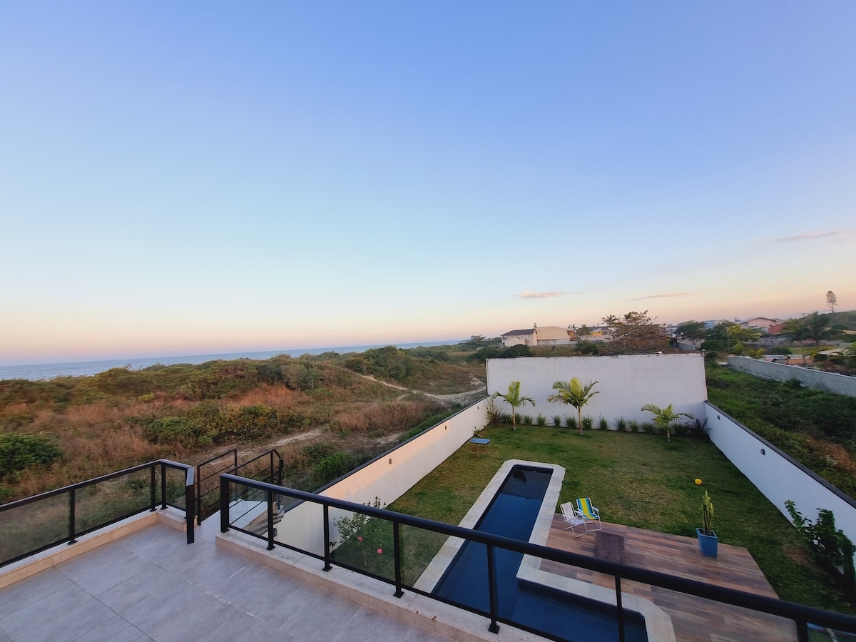 Casa frente al mar con 5 suites, sala de estar/comedor con chimenea, cocina y barbacoa integradas a la sala con vista frontal al mar, baño, lavandería y dep. de empleada. Salas y suites con aire acondicionado. La casa tiene wifi y está bien equipada. Cuenta con una terraza de madera con mesa, sillas y tumbonas a 10 metros de la playa. Ubicación privilegiada, en medio del condominio frente al acceso privado a la playa y también frente a la piscina. Se encuentra en un condominio cerrado pequeño y tranquilo.