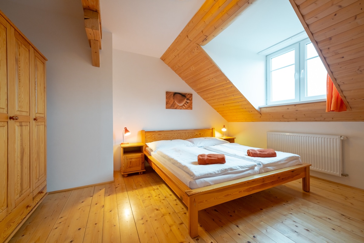 El departamento está ubicado en una villa renovada de la Primera República en las afueras de las montañas Jizera. Ofrece alojamiento espacioso para hasta 7 personas, ideal para familias y grupos de amigos. Hay tres dormitorios con cuatro camas dobles y una cama individual. El departamento también tiene un sauna privado, perfecto para relajarse después de un día en la montaña. Hay una cocina moderna, baño, TV, videojuegos, Nintendo, Wi-Fi, textiles de hotel y estacionamiento junto a la propiedad.
